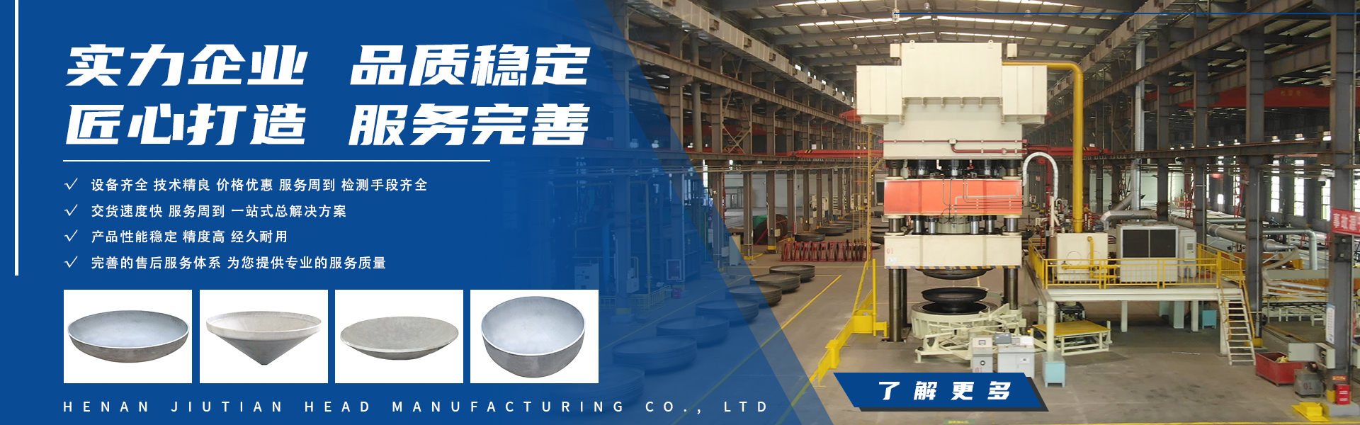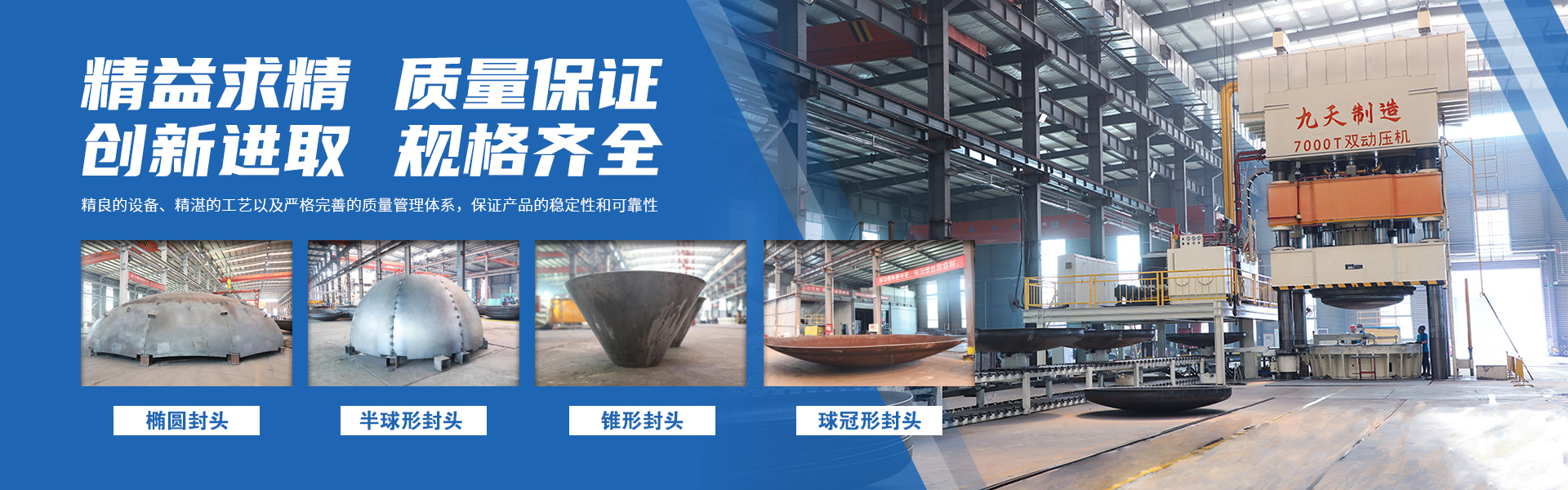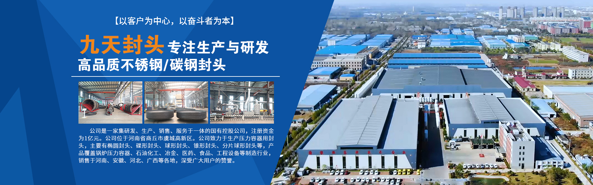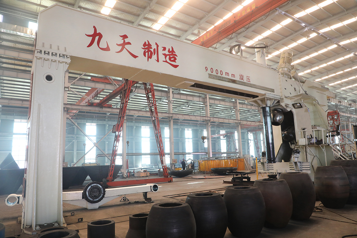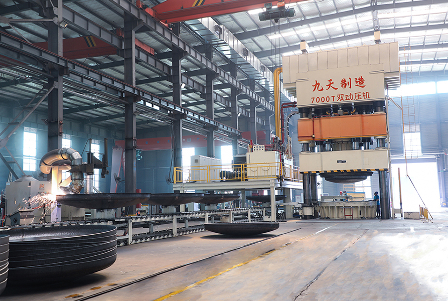 河南九天封頭制造有限公司是一家集研發、生產、銷售、服務于一體的國有控股公司,注冊資金為1億元。公司座落于河南省商丘市虞城縣高新技術開發區,南北相臨京九鐵路、濟廣高速,東西有連霍高速、隴海鐵路穿境而過,位置優越交通極為便利。 公司主要設備有600T—36000T的雙動壓機各1臺,3.5米—13米的旋壓機組各1套,6000W—30000W激光下料機6臺,6米、8米的等離子焊機及1米、1.6米、2.6米、5米的立車各1臺,龍門式20000W三維激光切割機、16米雙頭龍門式銑邊機、14.5米井式燃氣熱處理爐、直徑10米封頭專用拋丸機各1臺,最高可達1300攝氏度的8.5米、6.5米、4米、2米熱處理爐各1臺,自動拼板焊機2臺,手工焊機若干臺等,以及與之配套的電液伺服萬能試驗機、全自動低溫沖擊試驗機、金相顯微鏡(含磨拋機、切割機)、觸摸屏式硬度計、臺式直讀光譜儀等各類金屬實驗設備。